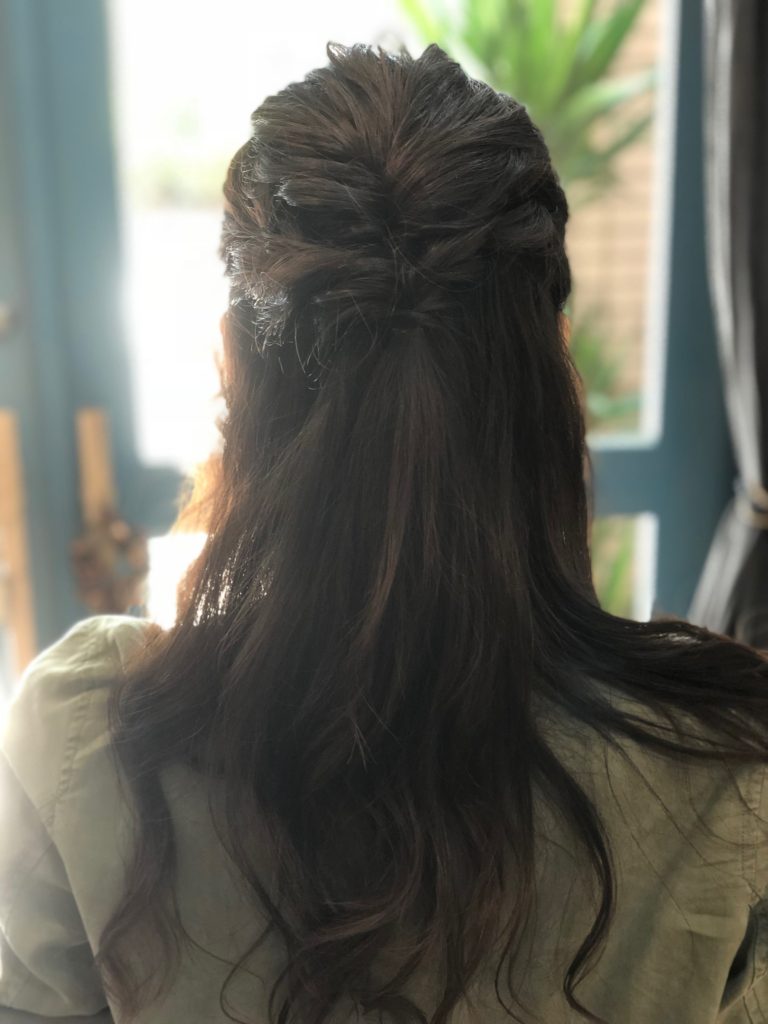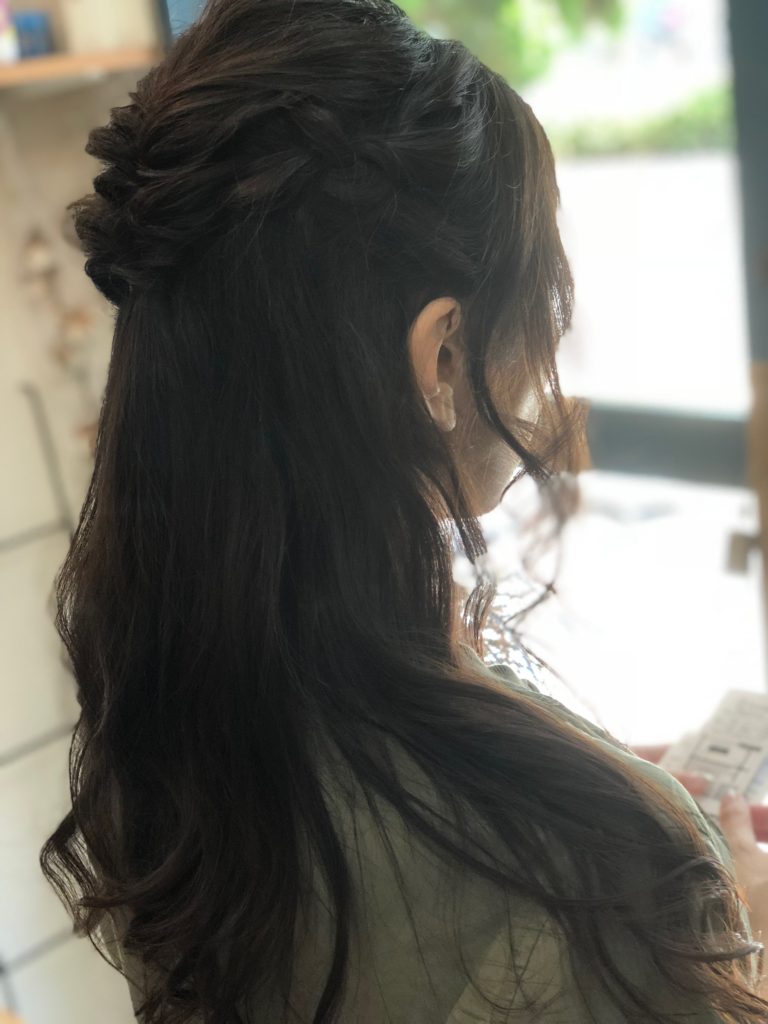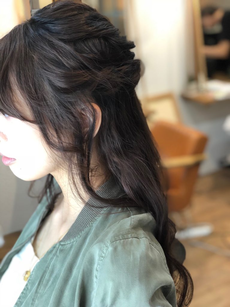 サイドの耳上部分は緩く編み込みながら後ろで合わせくるりんぱで完成です!
