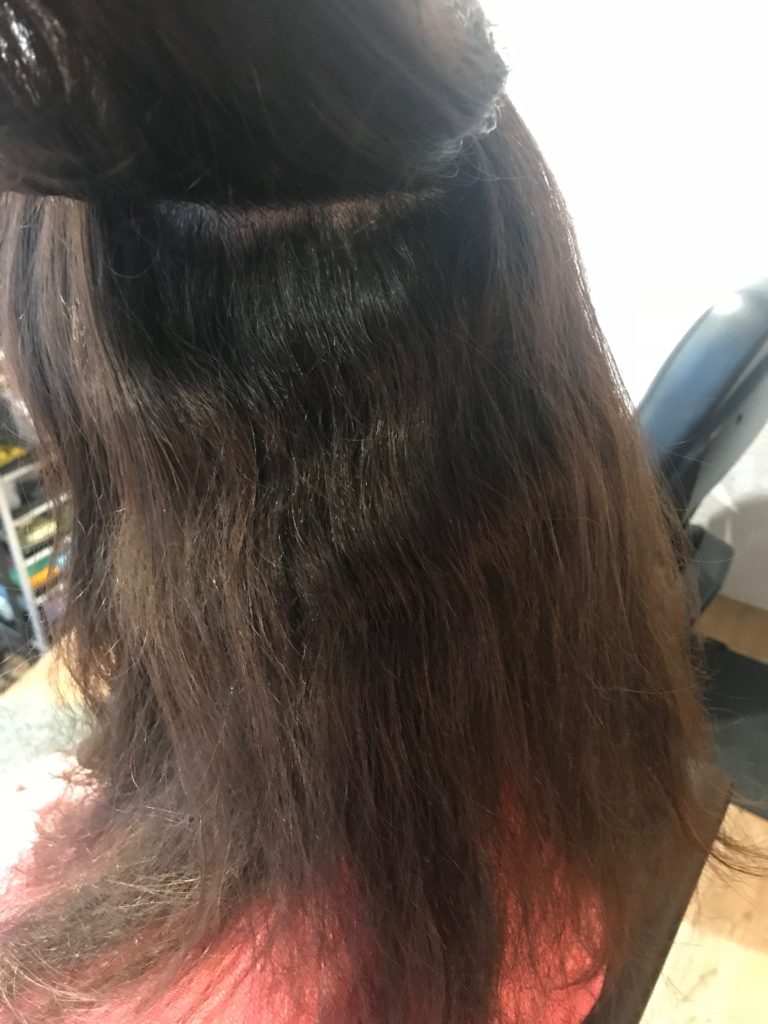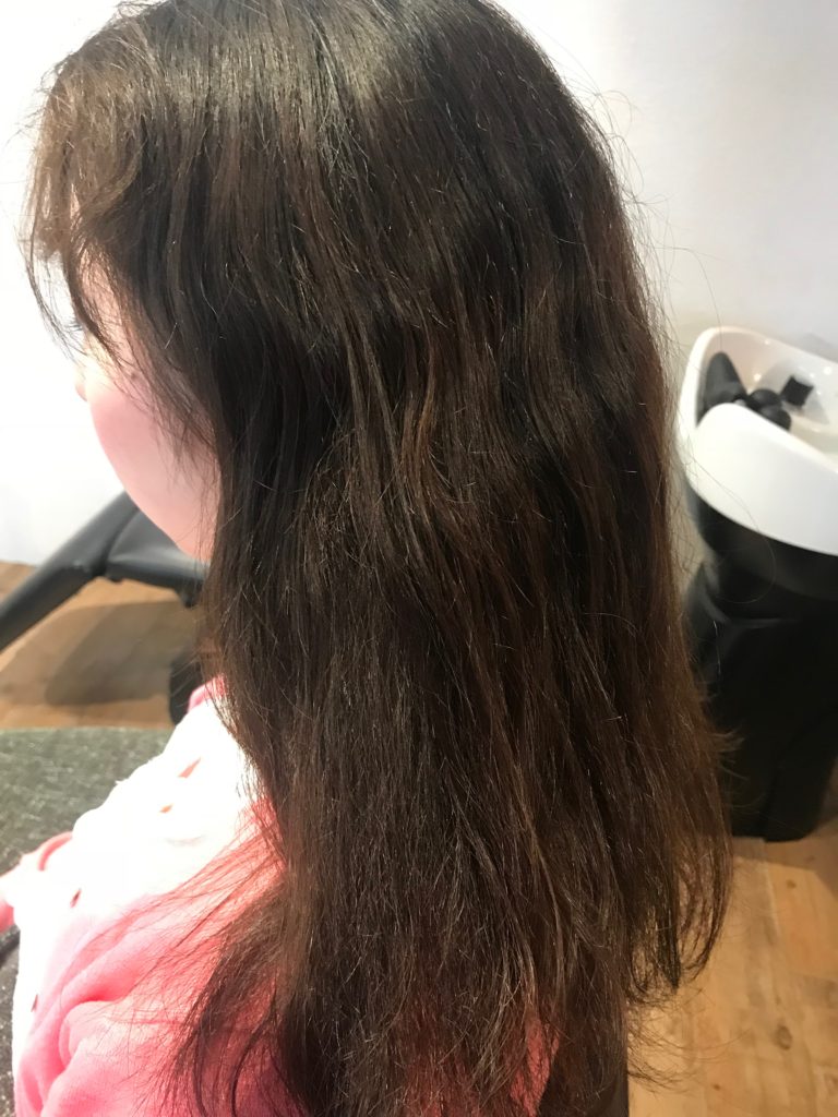 強めの波状毛で細めで柔らかい髪質のお客様です